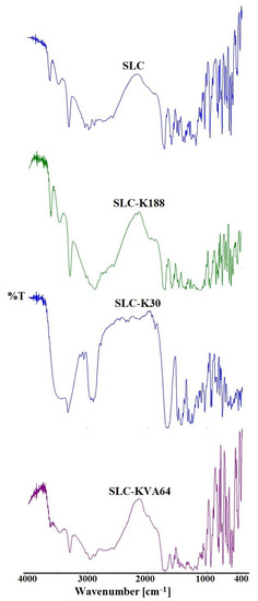 Comparative FTIR spectra of pure SLC, SLC-K188, SLC-K30, and SLC-KVA64.
