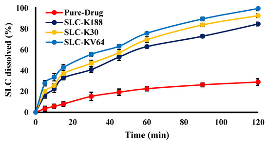 Researchers have explored solid dispersion/inclusion complexation to improve the solubility, permeability, oral bioavailability, and therapeutic effectiveness of SLC through its encapsulation with polymers, with the aim of achieving an enhanced drug release [8]. In vitro release profiles of SLC from the prepared solid dispersions (SLC-K188, SLC-K30, and SLC-KVA64) are presented in Figure 6. Enhanced dissolution of SLC was noted in all solid dispersions. The pure SLC drug showed a much lower and incomplete release (29.08%) during the time-scale of the study (2 h). However, an almost complete release of SLC was observed from all the prepared solid dispersions. The maximum drug release was recorded by the SLC-KVA64 system (99.74%) after 2 h. The improvement in dissolution rate of SLC in a solid dispersion can be attributed to the dispersion of hydrophilic polymers, due to the wettability of the drug, which resulted in an enhancement in solubility [44]. These results suggest that the use of hydrophilic polymers as the carrier transformed the SLC crystals into an amorphous state, which improved the solubility of the drug. However, the highest release of SLC from SLC-KVA64 could possibly have been due to the maximum amorphization of SLC, wetting properties of SLC-KVA64 polymer with SLC.
