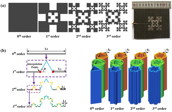 (a) Koch and Sierpinski patterns inspired antenna design [9], reproduced courtesy of The Electromagnetics Academy; (b) Koch snowflake inspired thin-walled structure design for energy absorption [51].