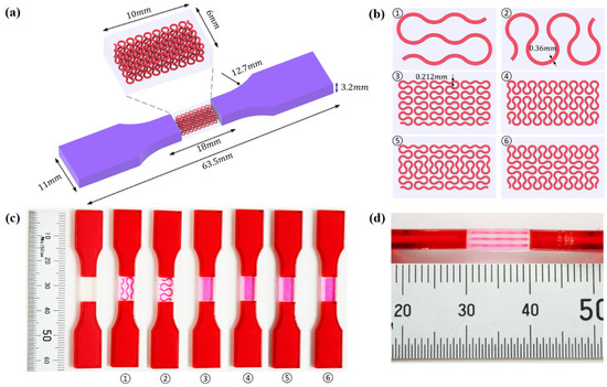 So far, no standard of the tensile test has been established for 3D-printed multi-material structures/materials. In this study, tensile samples are designed according to the ASTM D638, with variations from the literature [62,63] as shown in Figure 3a. Two categories of samples are prepared for further analysis. First, homogeneous A30 samples are printed to capture their individual mechanical properties, thereby providing a reference to composite materials. Then, six designs of hybrid samples (Figure 3b) are fabricated, with A30 serving as the matrix of gauge section, and VMV as both the reinforcements and extended sections. Figure 3b schematically shows the gauge sections of six heterogenous designs, reinforced with differently orientated and hierarchical Peano curves, including pure vertical first order, pure horizontal first order, pure vertical second order, pure horizontal second order, mostly vertical second order, and mostly horizontal second order. The reinforcements are distributed in three layers at a spacing of 1 mm. All the hybrid tensile structures were reinforced with VMV at a volume fraction of 5%. Thus, the diameters for the first and second order Peano reinforcements are 0.36 mm and 0.212 mm, respectively. Figure 3c depicts the 3D-printed tensile samples.