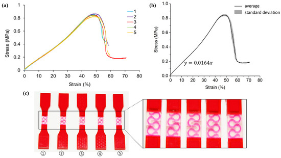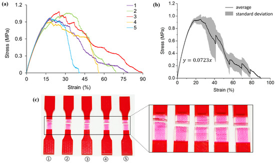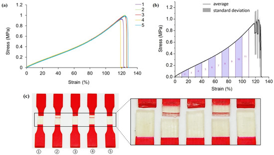 (a) Stress-strain curves obtained from tensile testing tests on non-reinforced A30 samples; (b) average tensile stress—strain curve and standard deviation of all five testings; (c) pictures of failed tensile samples with zoom-in at the locations of fracture.