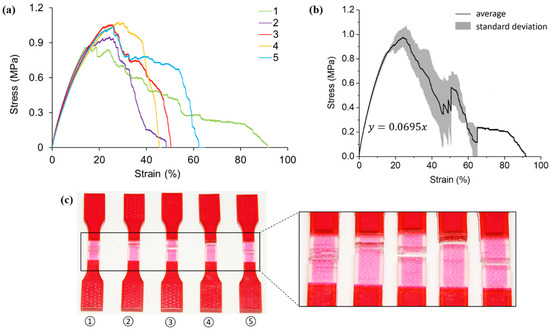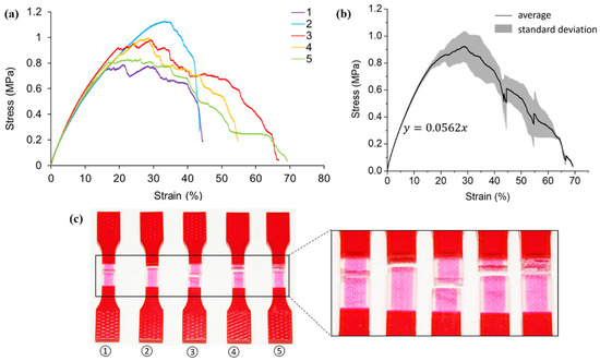 Figure 4c depicts the failure samples with a magnified picture at the gauge sections. Fractures are identified to happen at different locations, including the gauge section (specimen two and four from left to right), close to the extension part (specimen one and three from left to right), and also at the interface of two different materials (specimen five). This phenomenon could ascribe to 3D printing defects.