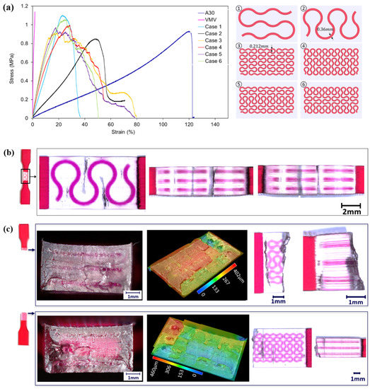 The tensile stress-strain curves and failed samples of the hybrid case six design are presented in Figure 10. The elastic stage, corresponding to a strain less than 10%, is quite repeatable for all specimens (Figure 10a) with an average elastic modulus of 6.95 MPa (Figure 10b). Obviously, the VMV reinforcement in case six enhances the stiffness of the coupon samples compared to homogenous A30. The elastic moduli of case four and case six are very close, owing to similar reinforcement alignments (orientation and hierarchy).