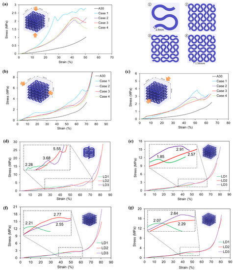Generally, the stress developed in all VMV reinforced hybrid samples is remarkably higher than that in homogenous A30 samples according to Figure 12a–c. The result indicates that the inclusion of the VMV Peano curve strengthens the A30 matrix regardless of loading directions. With regards to different reinforcement hierarchies, it could be observed that the composite materials with the first order reinforcement (case one) yield a higher compressive strength than the second order materials (case 2–4). This phenomenon ascribes to a larger diameter of reinforcement in the hybrid case one design (2.8 mm) than the other cases (1.56 mm), given the same volume fraction of 10% for all. It is also worth noticing that the responses of case two, case three, and case four are relatively similar for all three loading directions. It is caused by their similar amount of reinforcement at the cross-section perpendicular to the compression force.