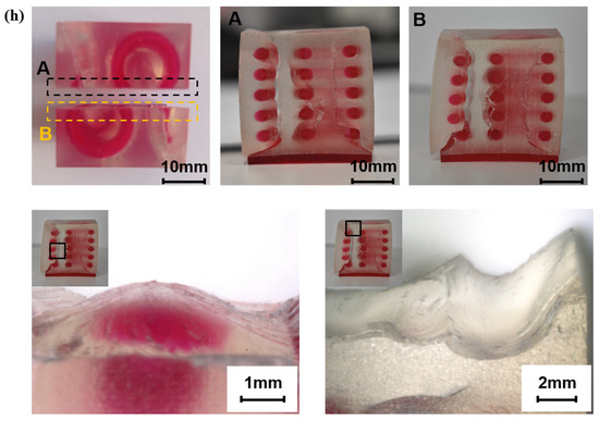 To investigate the failure pattern of compression cubes, high resolution pictures and optical microscope images are taken to capture the fracture surfaces of failed samples. As compression samples are not broken into pieces, a bandsaw is used to cut the failed specimens in half along the compressive loading directions. Figure 12h shows the fracture surfaces of the hybrid case one specimen after compression from loading direction one. The high-resolution images of cross-section A and B, in the top row, clearly show the existence of wavy cracks in the A30 matrix. Supportive information is provided by the microscope images of the fracture surfaces (bottom row of Figure 12h). Transparent A30 is observed on top of VMV (bottom left image in Figure 12h), indicating the existence of a crack in the matrix rather than any debonding of A30/VMV. The results imply that the interface between two different materials is relatively strong. Furthermore, a concave surface is captured in A30 after the compression (bottom right image in Figure 12h). The reason behind this phenomenon is the same as the wave-shape cracks observed in tensile samples. To be more specific, it is caused by the stress concentration in the A30 matrix due to the curved design of VMV reinforcement.