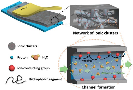 - Wu, L.; Zhang, Z.; Ran, J.; Zhou, D.; Li, C.; Xu, T. Advances in proton-exchange membranes for fuel cells: An overview on proton conductive channels (PCCs). Phys. Chem. Chem. Phys. 2013, 15, 4870–4887. [Google Scholar] [CrossRef] [PubMed]