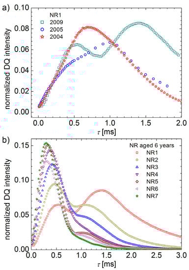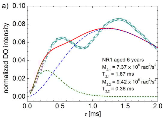 The DQ build-up curve was recorded from the unaged NR1 sample after the vulcanization (see Table 1) and is shown in Figure 1a. A single component can be observed with a maximum around 700 μs. The maximum DQ signal is obtained from the combined effect of an increase in the intensity of the DQ coherences and decay of the single-quantum coherences due to transverse relaxation during the excitation and reconversion periods of the pulse sequence.