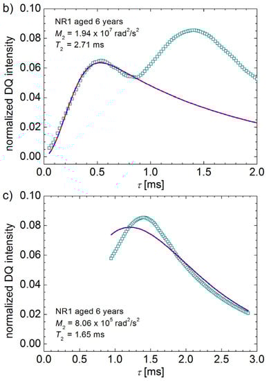Figure 2a shows the attempts to fit the experimental data using Equation (2) for NR1 sample six years aged. The failure is due to the fact that Equation (1) is not able to describe the experimental DQ build-up curves for the full excitation/excitation time regime. The best fit of the DQ build-up curve for the aged NR1 sample can approximate only the initial regime and fails dramatically for excitation/reconversion times larger than 0.3 ms (see Figure 3a). Moreover, the function described by Equation (2) as the superposition of two individual components, presented with dashed and short dashed lines in Figure 2a, is not showing a distinct double peak feature. As one can observe from this figure the smallest (left) peak can be approximated but for the large component (right) the theoretical peak (dashed line) is much broad. In fact, the fit of the first component can be conducted relatively well, as one can see from Figure 2b. For this fit, we consider only the experimental data up to ~0.85 ms of the beginning of the second built-up curve. Even in the absence of the small peak, if the behavior is described by Equation (1), the right peak cannot be approximated by any values of and (Figure 2c).