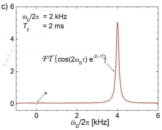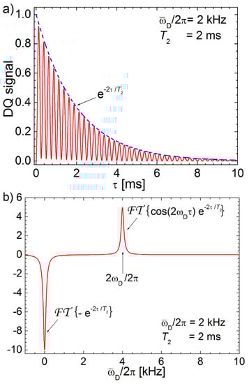 Figure 3a presents a simulation of a DQ signal (continuous line) for an ideal polymer characterized by a single value of the residual dipolar constant and an envelope of NMR signal (dashed line) characterized by the transverse relaxation time . We will use this simulated curve to demonstrate the simplest procedure based on the Fourier transform, (hereafter we use the notation FT {…}) to obtain the distribution of the residual dipolar couplings. The negative Fourier transform, −FT {…}, of the DQ filtered signal is presented in Figure 3b. The spectrum can be easily interpreted if we will rewrite the Equation (3)