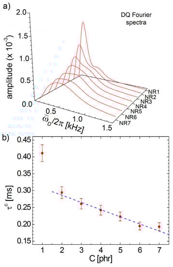 Figure 4a presents the distributions of residual dipolar coupling as a corrected Fourier transform of normalized DQ build-up curves for the entire cross-linked series of NR samples while the Figure 4b presents the dependence of the on the cross-link density obtained using the Equation (9). The correction time characteristic to the NR series, with the exception of NR1, decays linearly with the increase in the cross-link density. Since all Fourier spectra are broadened due to the relaxation processes, the residual dipolar coupling distributions present two unresolved peaks (see Figure 4a). These two peaks are more evident for the NR1 sample and merge totally for the NR7 sample. With the increase in the cross-link density the distributions of becomes broader. At a simpler inspection, the residual dipolar coupling distributions look similar to those obtained in the case of spin-½ approximation, and this is the reason why the Fourier spectra are not presented for spin-½ approximation. In fact, in the following section, we will demonstrate the differences between the obtained spectra, considering the previous described approximations are so small that they can be neglected, compared with the differences between the DQ Fourier spectra obtained for different samples.