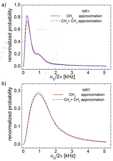 In order to be visually compared, in Figure 5 the distributions for both the spin-½ pair approximation (continuous black line) and for the isolated CH3 and CH2 functional groups approximation (dashed grey line) were represented together for the first and last series samples, which are NR1 and NR7. In order to evaluate the deviation of a curve from another curve, the merit value χ2 can be defined as