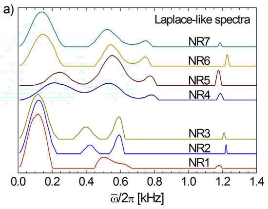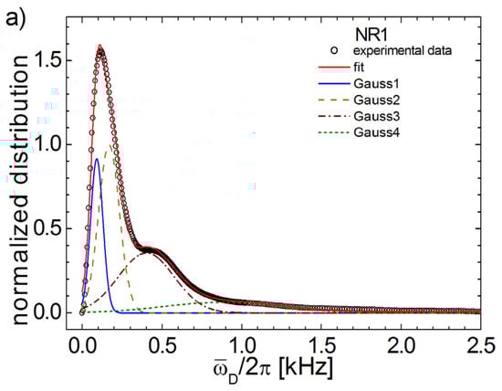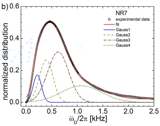 The normalized distributions of the residual dipolar couplings, or with other words, the 1H DQ Laplace-like spectra, are presented in Figure 10a for all naturally aged rubber samples. All 1H DQ Laplace-like spectra consist of four well-resolved peaks with one exception: the middle peaks for the aged NR1 sample. For small and large values of cross-link density, the main peak is characterized by a reduced value of averaged residual dipolar couplings (). From this point of view, the samples NR4 and NR5 are not in the range and present the first peak at . This is not a surprising result, since in some of our previous results [19,39], the NR4 sample was also showing a different behavior for various measured microscopic NMR parameters and elasticity modulus.