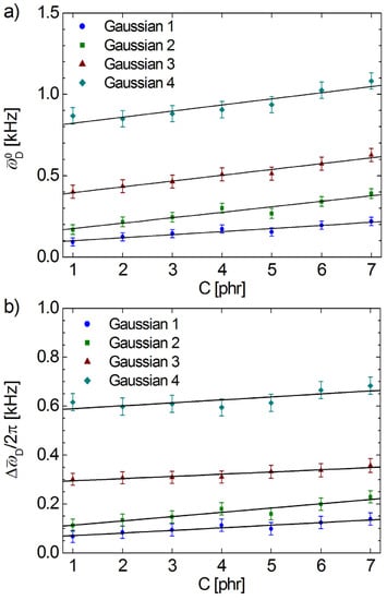 The dependence of (a) the mean value of the residual dipolar couplings and (b) line width for the Gaussian distribution functions of the cross-link density C (sulfur accelerator content—phr). In all cases, the lines represent the best fit of the data.