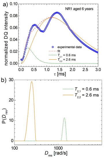 where we assumed an effective averaged transverse relaxation time. A complete mediation over end-to-end vector or/and azimuthally angle β, and the distribution of the residual dipolar coupling constant Dres, is presented in the Supplementary Information with many details. The best fit of the DQ build-up curve measured for natural NR1 aged during six years of analyses by Laplace-like inversion using Equation (S12) with the kernel presented in SI.13 (see Supplementary Information) and with the best transverse relaxation times and , respectively, is presented in Figure 8a. Unfortunately, the best fit curve (dashed red line) cannot explain the bimodal character of the measured data for six years of naturally aged NR1. The overlap of the two signals originating from a large residual dipolar coupling constant Dres (olive dotted line) characterized by and from a small residual dipolar coupling constant Dres (olive dotted line) characterized by present just a small shoulder at the initial time regime. This fit is similarly with that presented in Figure 2a and analyzed in terms of second van Vleck moments analyzed with Equation (4). The distributions of the small and large values of residual dipolar coupling constant Dres are presented in Figure 8b. Slightly asymmetrically, these distributions are similarly with those reported in several papers for the residual dipolar coupling constant Dres [41,42]. Then, the complete mediation over and β was proved not to be able to describe the measured bimodal DQ build-up curve for natural aged NR samples, but could be used to describe a bimodal DQ build-up curve for a non-aged PDMS1 sample [25] (for more details, see the Supplementary Information).