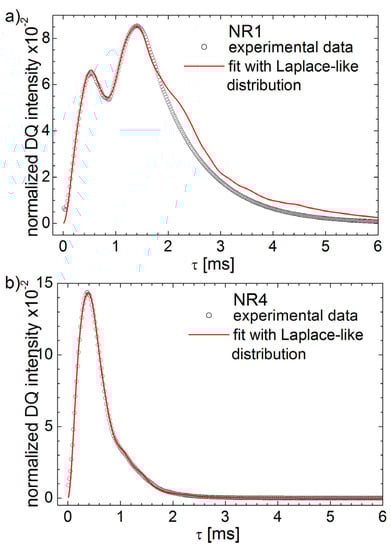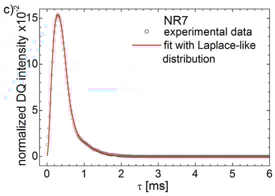 The experimental 1H DQ build-up curves and fits with Laplace-like inversion procedure are presented in Figure 9 for natural aged samples NR1, NR4 and NR7. The inverse Laplace-like procedure can fit well the 1H DQ build-up curve recorded for the aged NR1 sample up to the maximum (τ ≅ 1.4 ms), but there are some deviations after this maximum (see Figure 9a). Nevertheless, this is a much better fit compared with the approximation obtained before with multi-moments method (see Figure 2), described in Section 3, since now both build-up components are fitted. The deviation observed at larger τ values is due to the fact that the special kernel used in this case is periodical and we assumed a single effective relaxation time .