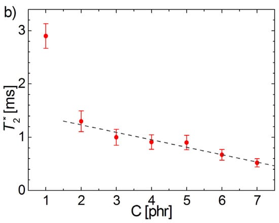 The best-fitted effective relaxation times for all aged NR1–NR7 samples are presented in Figure 10b as a function of cross-link density. As in the case of correction time obtained by 1H DQ Fourier spectra (see Figure 4), a linear dependence of as a function of cross-link density can be observed, with the exception of the NR1 sample. From our observation, the value of can have a certain influence on the 1H DQ Laplace-like spectra (Figure 10a), but in the fitting error limit (see Figure 10b) this can be negligible compared with the differences between DQ Laplace-like spectra.