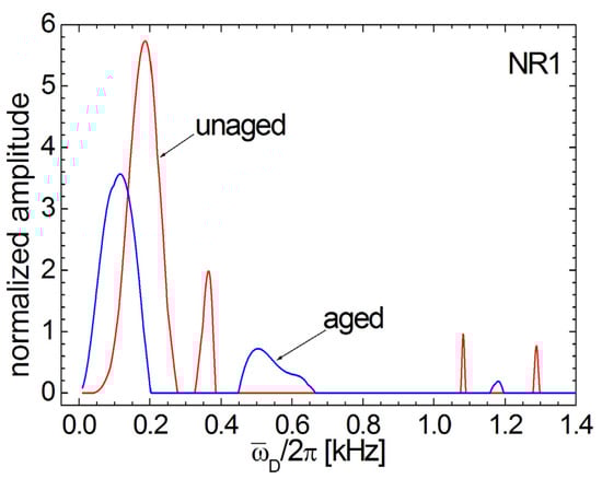 Figure 11 presents a comparison between the normalized 1H DQ Laplace-like spectra corresponding to aged and unaged NR1 samples. Additionally, the unaged 1H DQ Laplace-like spectrum is composed of four peaks but with a different distribution. Two large distribution peaks are located at lower residual dipolar coupling values (), and two smallest peaks are located at larger residual dipolar coupling values ( ). The peaks located at lower residual dipolar coupling values are in agreement with the results obtained by Nie et al. [34] and with the distributions reported in [35,36,45]. After an aging in natural conditions, many of the NR1 polymer chains characterized by a small value of become more mobile and have a reduced residual dipolar coupling (see the left large peak). The polymer chains with a small value of together with the polymer chain with become more rigid at . After aging, the two peaks located at larger residual dipolar coupling values collapse into a small peak located between them at . It is evident from Figure 11 that the aging process induces a much broader heterogeneity in RDC and is characterized by larger mobility of polymer segments.