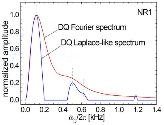 The comparison of 1H DQ Fourier and DQ Laplace-like spectra for the NR1 natural rubber sample, natural ages during six years are shown. The two spectra were renormalized in order to have the maximum value equal to one. The vertical dashed lines were drawn to cross the Fourier and Laplace-like spectra for the position of the local maxima for the four peaks corresponding to Laplace-like distribution.