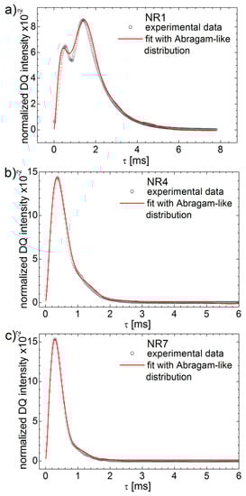 The best fits of the experimental DQ build-up curves obtained using Equation (21) with the Abragam-like kernel are presented in Figure 13 for NR1, NR4 and NR7 natural rubber samples aged for six years. In all cases, one can remark a good fit of the experimental data. Among these, as expected, the largest value of the merit function (see Equation (10)) was obtained for NR1. This is due mostly to the fact that the experimental data are not so well approximated in the initial time regime up to τ ≅ 1 ms. With the increase in cross-link density, the effect of aging is reduced and the DQ build-up curves are better approximated on the entire time scale (see Figure 13b,c).
