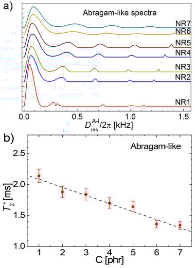 In Figure 14a, the distributions of for the six-year-aged cross-linked natural rubber series (NR1-NR7) obtained using Equation (21) with the Abragam-like kernel (Equation (22)) are presented. Compared with the series of distributions of the residual dipolar couplings (shown in Figure 7a), in this case: (i) the main peak (with the largest integral area) is located at low value (~53.2 Hz for NR1 to ~86.1 for NR7); (ii) a series of four (an additional one) peaks are observed at large value all with a more small amplitude; (iii) the variation of -distribution in function of cross-link density is more smooth than in the case of -distribution. Regarding the number of components and the particular domain, the obtained distribution of is similar to those reported by Chassé et al. in ref. [42] for a mixture of NR–C2 samples. In the experimental error limit, the variation of the effective transverse relaxation time , with cross-link density, decay linearly for the entire series NR1 to NR7 (see Figure 14b).