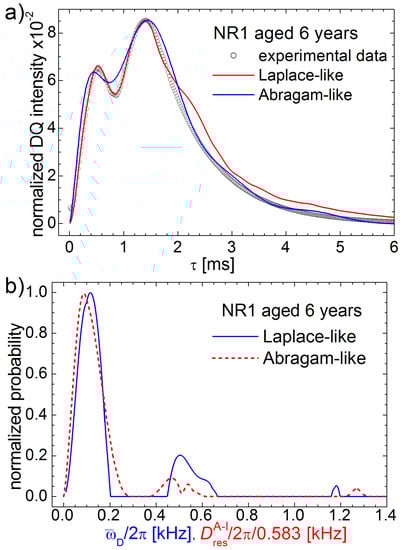 Comparing the best fit of DQ build-up curves measured for aged NR1 and analyzed spin-½ pair approximation (blue continuous line in Figure 15a) where the curves are well approximated in the initial time regime, inclusive of the maximum doublet, in the case of an Abragam-like kernel (red dashed line in Figure 15a), the experimental data are much better approximated for a medium and large excitation/reconversion time, τ, but not so well in the region of the maximum doublet. Due to this fact, one can consider that the spin-½ pair approximation (leading to so-called Laplace spectrum) is more precise in order to describe the effects of natural aging of natural rubber on the measured bimodal DQ build-up curve than in the case of the use of the Abragam-kernel. Nevertheless, one can expect similarly results. In order to test this hypothesis, the so-called Laplace-like and so-called Abragam-like distributions are represented together in Figure 15b for the NR1 natural sample aged for six years. The spectra are renormalized so that the maximum amplitude is 1. The Abragam-like distributions are rescaled with a factor of 0.583 present in Equation (22), where the Abragam-like kernel was defined. In the presented range, both distributions can be considered similarly.