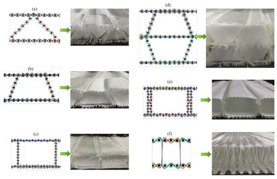 In light of the above discussion, intensive research has been carried out to investigate and establish the relative mechanical advantage of some special textile structural composites using a wide range of preform architectures starting from simple chopped fiber to the most complex 3D structures, such as energy-absorbing hollow structures, honeycomb structures, spacers with augmented cores, profiled structures, stiffeners, and aerodynamic structures [47,48]. Woven spacer fabrics with woven cross-links and different cell geometries were produced. The sandwich composites were analyzed for their quasi-static lateral compression and flexural performance to compare their load-bearing capacity and energy absorbency [49,50,51,52,53]. Further, complex profiled 3D fabrics, e.g., I, U, + or X shapes are used in composites where superior joint strength is desired [54,55].