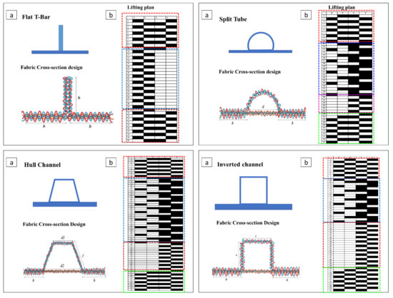 (a,b) Line diagram showing the geometry of the developed preform structures; (c) +-profiled and (d) U-profiled integrated woven profiles.