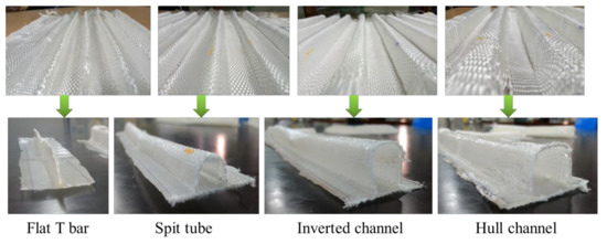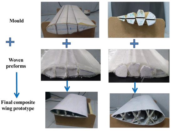 The UD, 2D and 3D woven fabric-reinforced composites were produced using the vacuum-assisted resin infusion technique. The spacer woven structures were converted to composites by inserting wooden blocks with an appropriate size and wrapped with a Teflon sheet into the hollow space before resin application. A vacuum-assisted resin infusion technique was used to produce spacer woven composites. The samples were cured for 24 h at room temperature. A similar technique was used to produce sandwich composites, composites reinforced with integrated stiffener section, profiled composites, and airfoil structures (Figure 7). The process of woven honeycomb and aerodynamic spacer composite development is depicted in Figure 6 and Figure 8, respectively.