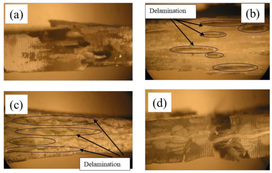The microscopic analysis (side view) of tensile-tested specimens is shown in Figure 10. The side view near the rupture point of UD fabric layers and 2D fabric layers reinforced composites are shown in Figure 10b,c, respectively. It is clear from the images that delamination is the main reason for the failure of these composites. In these UD and 2D fabric-reinforced composites, the interlaminar connection is only by the matrix. This would form distinctive layers in the composites. When the composites are subjected to tensile loading, the interlaminar shear force will be exerted in the matrix region between the fabric layers. As the matrix has very poor shear strength, it will crack very quickly during loading. This crack in the matrix will increase in the loading direction with an increase in the tensile stress and ultimately lead to the composite’s failure.