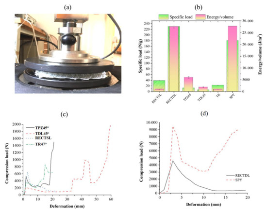 (a) Quasi-static compression test, (b) specific compressive load and energy/volume of different spacer composites, (c,d) compression load–deformation curves of different sandwich composites.