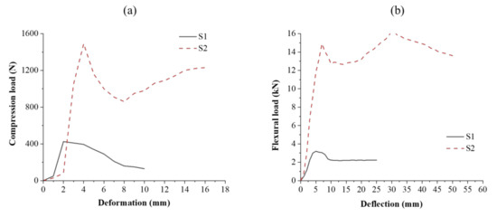 (a) Compression load–deformation and (b) flexural load–deflection curves of sandwich composites with an augmented core.