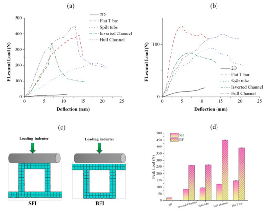 Flexural load–deflection plots of composites with different stiffener sections in (a) BFI and (b) SFI mode; (c) flexural loading configuration of composite samples; and (d) comparison of the peak load of different composites.