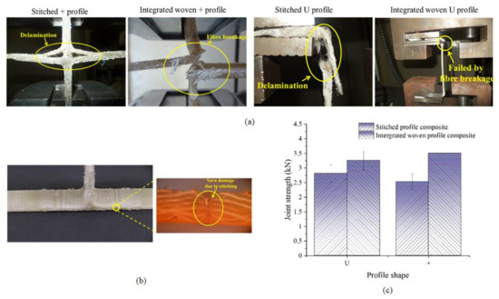(a) Joint strength fractured stitched and integrated woven + and U profiled composite; (b) optical microscope image of stitched composite showing yarn damage due to stitching; and (c) comparison of joint strength of profiled structures and their composites.