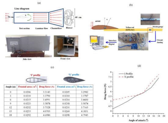 (a) Line diagram and actual wing tunnel developed in the laboratory; (b) drag force measurement set up installed associated with wind tunnel; (c) frontal areas considered, and theoretical drag force calculated at their corresponding angle of attack; (d) drag force at a different angle of attack for ‘I’ and ‘X’ profiles.