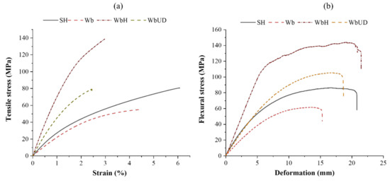 (a) Tensile stress–strain curves; and (b) flexural stress–deformation curves of composite laminates.