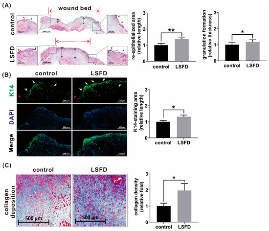 3.3. β-Sheet LSFD Accelerated Re-Epithelialization and Granulation Formation in Burn Wounds