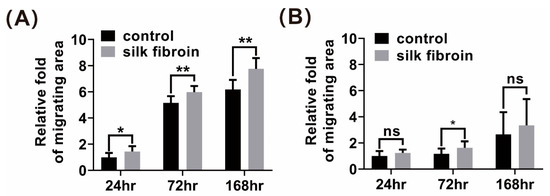 - Martinez-Mora, C.; Mrowiec, A.; Garcia-Vizcaino, E.M.; Alcaraz, A.; Cenis, J.L.; Nicolas, F.J. Fibroin and sericin from Bombyx mori silk stimulate cell migration through upregulation and phosphorylation of c-Jun. PLoS ONE 2012, 7, e42271. [Google Scholar] [CrossRef] [PubMed]