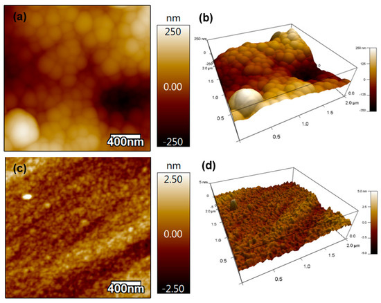 The thickness of the Si-DLC coatings on Si substrates was measured at five random positions on the coating; the measured thickness value was 380 ± 19 nm. This thickness value corresponds to a deposition rate of ~6 nm/minute. Figure 2 contains the 2D and 3D AFM results from Si-DLC coatings on the polymer material (Figure 2a,b) and Si substrate (Figure 2c,d). No pinholes were noted on the coated surfaces. The root-mean-square (RMS) roughness values over a 2 µm × 2 µm surface area of the Si-DLC coating on the polymer material and the Si-DLC coating on the Si substrate were 86.5 ± 45 nm and 0.58 ± 0.3 nm, respectively. The RMS values of the uncoated polymer substrate and silicon substrate were 10.658 ± 8 nm and 0.7 +/− 0.2 nm, respectively. The low RMS roughness values of the Si-DLC coating on both substrates indicated the uniformity of the coating.