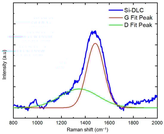 Raman spectroscopy is a powerful tool to understand carbon bonding in carbon-containing coating. Figure 4 contains the Raman spectrum obtained from the Si-DLC coating on the silicon substrate over the range of 800 to 2000 cm−1. Since distinguishing between the Raman spectral features associated with carbon bonding in the polymer material and the Si-DLC coating is difficult, we acquired the Raman spectrum from a Si-DLC coating on a silicon substrate. The peak around 1000 cm−1 is attributed to the silicon substate. In DLC coatings, the Raman spectrum takes the shape of a broad band between 1100 cm−1 and 1700 cm−1, which is comprised of two peaks at approximately 1350 cm−1 and 1580 cm−1. The D peak at ~1350 cm−1 is assigned to the A1g symmetric breathing mode; the G peak at ~1580 cm−1 is assigned to the zone-center mode of E2g symmetry [23,24,25]. The visible wavelength excitation source used in this study preferentially resonates with π states. Therefore, the sp2 bonds (π bonding) are detected 50 to 230 times more strongly than the sp3 bonds (σ bonding); the D peak appears as a shoulder peak [7,23,25]. In Figure 4, a Gaussian distribution was utilized for the deconvolution of the D and G peaks from the broad DLC band; the D and G fit-peaks are located at 1349 cm−1 and 1482 cm−1, respectively. In comparison with DLC coatings, Si-DLC structures show a downshift in the positions of the D and G peaks [26]. There are several reasons for the downshift of the D and G peaks with the incorporation of silicon in the DLC coating. In contrast with carbon atoms that form three-fold- and four-fold-coordinated bonds, silicon atoms form four-fold-coordinated bonding in DLC structures. Since silicon cannot form π-bonds when present in DLC structures, the sp3 to sp2 ratio in Si-DLC coatings increases, and the size of the graphite-like domains is reduced. The enhancement in sp3 content with the addition of silicon also reduces the internal residual stress in the DLC coatings. Consequently, silicon incorporation increases the adhesion of the Si-DLC coating to the substrate [15]. Therefore, the downshift in the position of D and G peaks in Si-DLC films is partially attributed to the reduction in the internal compressive stress that is associated with the presence of the silicon atoms. In other words, the vibration of the de-strained bonds occurs at lower frequencies. Moreover, the addition of silicon to the DLC coatings weakens the carbon–carbon bonds through the formation of silicon–carbon bonds, which culminates in a downshift in the frequency of D and G peaks and a reduction in the ID/IG ratio [27].