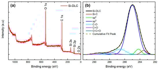 (a) XPS spectrum of the Si-DLC coating on a silicon substrate. (b) Deconvolution of the high-resolution C 1s band of the Si-DLC coating.