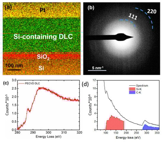 A sample of the Si-DLC coating on the silicon substrate was prepared by focused ion beam (FIB) processing; EDS data was collected from the FIB-processed sample (Figure 6a). The elements were mapped in different colors; Si (in ochre), oxygen (in red), carbon (in green), and Pt (in yellow). The presence of Si was observed in the Si-DLC coating. The selective area diffraction (SAD) pattern from the Si-containing DLC coating is shown in Figure 6b. A small SAD aperture was used such that it only covered the Si-DLC coating; no stray signal from the Si/SiO2 interface or Pt was noted. The diffraction shows characteristic carbon (111) and (220) rings. The diffused rings confirm the amorphous nature of the Si-DLC coating.
