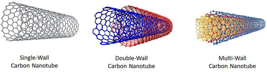 There are three types of CNTs, all of which are separated based on the number of inner walls within the CNTs. The first of which is the SWCNT. SWCNT consists of a single sheet of graphene that is rolled up to form a cylinder with diameters around the range of 0.4–3 nm. Catalysts are used during the chemical vapor deposition (CVD) process, which is an easy to control and efficient way to produce SWCNTs on an enormous scale with low cost yet with high product purity [30].