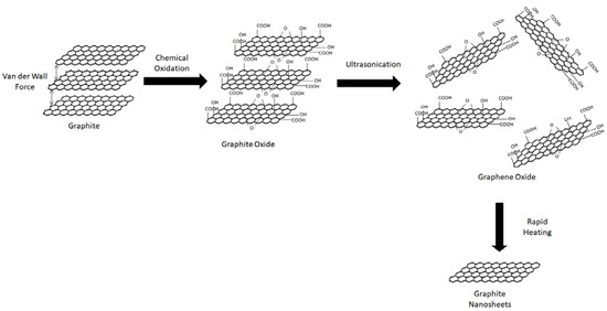 Additionally, exfoliated graphite or graphite oxide also plays a part in producing polymer nanocomposites with better properties. For example, Fukushima et al. [55] managed to synthesize nylon and polypropylene composites with enhanced thermal conductivity using the carbon nanosheets as the nanofiller. This is proven when the thermal conductivity of the polyamide-6/exfoliated graphite composite reaches its highest value of 4 Wm−1 K−1 at 20 vol% graphite loading, compared to that of the control polyamide-6 (with only 0.25 Wm−1 K−1). The chemical exfoliation is performed via oxidation of graphite by sulfuric and nitric acid, with the nitric acid performing as the oxidizer while the sulfuric acid will intercalate the graphite layer. The graphite is then exfoliated when rapid heating is applied because the layers will expand, which is caused by the vaporization of intercalated acid within the graphite. Finally, the created carbon nanosheets are then dispersed into the polymer matrix. The exfoliation process is described in Figure 3.