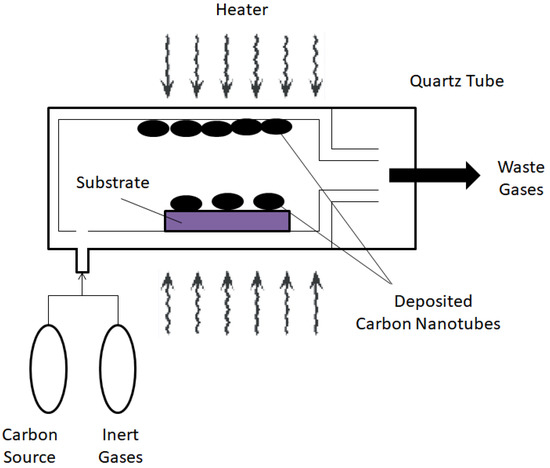 There are different types of CVD available, such as the plasma enhanced CVD, which can be used for the formation of various carbon nanomaterials, such as CNTs and graphene films. Other types include the microwave plasma CVD, hot-filament CVD and radio frequency plasma enhanced CVD. For example, carbon nanoflakes were successfully grown on a silicon substrate via hot-filament CVD using methane gas as a carbon precursor [59]. The CVD reaction occurred at 840 °C for 2 h in a H2/Ar/methane precursor gas mixture, with a flow rate ratio of 15/84/1. Additionally, the chamber pressure was kept at 1000 Pa while the substrate temperature was maintained at 2400 °C.