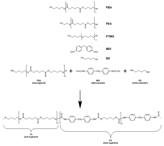 In addition to the chemical composition, another important parameter in TPEs is the hard-segment content. TPUs are segmented polymers where the macroglycol chains constitute the so-called soft segments (SS) whereas the segments produced by the reaction of the diisocyanate MDI with the chain extender BD constitute the so-called hard segments (HS), as seen in Figure 3.