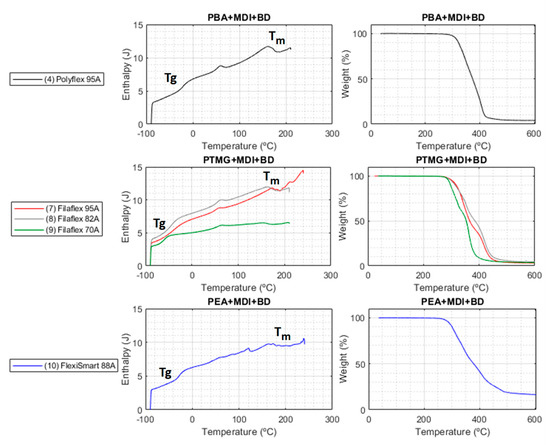The thermal behaviour of the different thermoplastic elastomers was investigated by dynamic scanning calorimetry (DSC) and thermogravimetry (TGA). A summary of the thermal properties of each filament is indicated in Table 2. On the one hand, DSC allowed us to determine the thermal characteristics of the material (Tg, crystallization and melting processes) which is particularly interesting to optimize the 3D printing fabrication conditions. In Figure 4, the DSC traces of illustrative examples of each type of TPU class (i.e., prepared using different macroglycols) and also, the Filaflex TPUs with variable hardness, are represented. The materials presented a Tg that varied depending on the type of material and the hardness. For instance, Innovatefil with a hardness of 83D showed a Tg of around +50 °C. The softest material, Filaflex 70 A, presented a Tg of around −60 °C. These differences allow to finely tune the range in which the material presents elastic properties by modulating the chemical composition. This can be also evidenced by focusing on materials (7), (8) and (9), i.e., Filaflex with variable hardness. In this case, the TPUs are constituted by the same chemical components but with different ratio and, as a result, the Tg gradually varied by from −37 °C down to −60 °C simply by decreasing the hard segment content in the TPU.