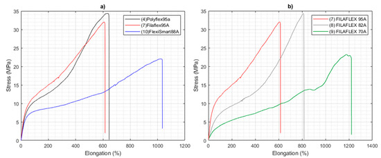 Stress-strain tests of the TPU filaments (a) Comparison of the different TPU classes as a function of the type of macroglycol employed, i.e., PolyFlex95A, Filaflex95A and FlexiSmart88A, (b) Comparison of the strain-stress curves for the same TPU class with variable hardness: 95 A, 82 A and 70 A.