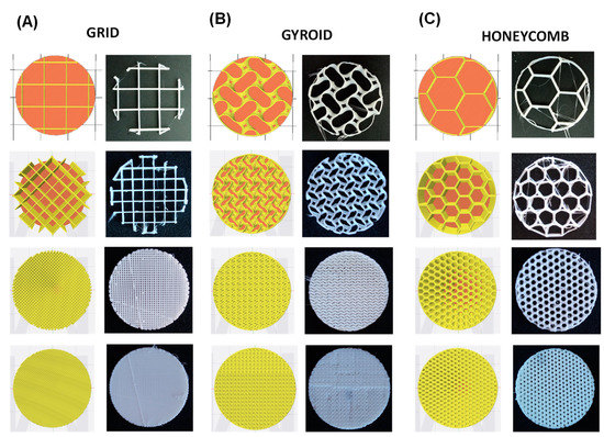 Illustrative designs and optical images of the types of infill and infill density of the patterns analyzed: (A) grid 10, 20, 50 and 80%, (B) gyroid 10, 20, 50 and 80%, and (C) honeycomb 10, 20, 50 and 80%.