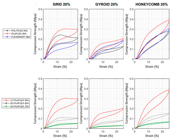 As showed in Figure 8 and Figure 9, clear inflection points were observed in the compression stress-strain curves for samples with 10% and 20% infill but not for those with higher infill densities 50, 80 and 100%. The compression curves of the grid pattern in both 10% and 20% presented a clear plateau whereas for gyroid and honeycomb with the same infill density the curves gradually grew. However, a change in the slope at around 8% of compression was clearly observed in the gyroid pattern and occurred more gradually in the samples manufactured using honeycomb pattern. Interestingly, the plateau observed was higher for Filaflex (0.3 MPa) than for Polyflex (0.24 MPa) and finally for FlexiSmart (0.16 MPa).