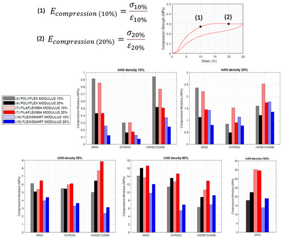 Compression modulus at 10% and 20% of deformation measured for specimens fabricated with Filaflex 95A, PolyFlex 95A and FlexiSmart. The measured specimens were fabricated with variable infill density and three different patterns (grid, gyroid and honeycomb).